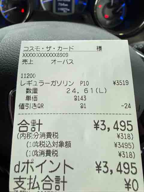 ポイントサイトの稼ぎで妻の車にガソリン満タン