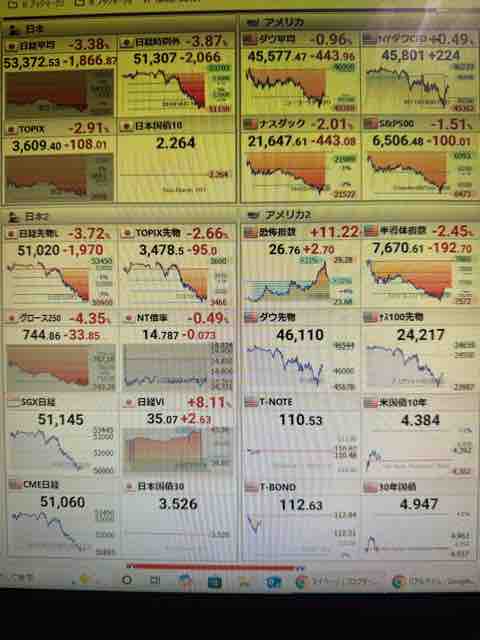 日経平均株価 53,372.53 -1,866.87 -3.38%